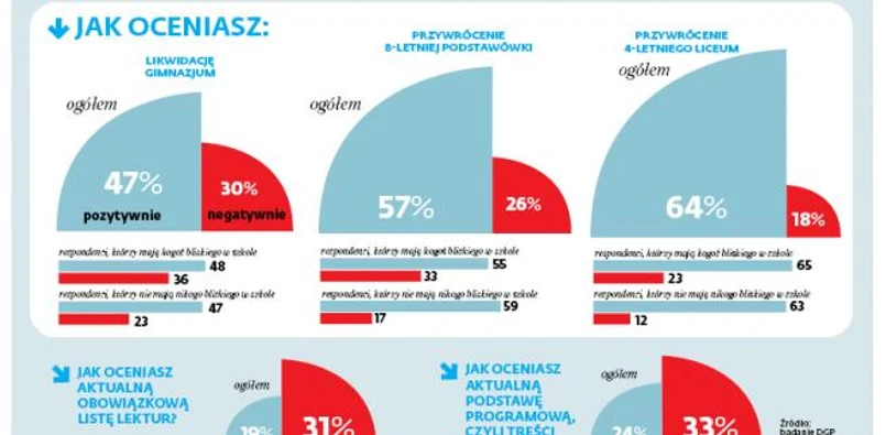 Po wprowadzeniu zmian w szkolnictwie poparcie dla nich spadło: negatywnie ocenia je niemal 37 proc. badanych. Dla porównania w lipcu 2016 r. było to 33 proc. Niezadowolenie z reformy edukacji jest jeszcze wyższe w grupie osób, które mają dzieci w szkołach – wynika z sondażu zrealizowanego dla DGP na panelu badawczym Ariadna. Co ciekawe, kiedy jest mowa o szczegółach zmian, reforma minister Anny Zalewskiej nie budzi już takich kontrowersji. Badanym najbardziej podoba się pomysł wprowadzenia czteroletniego liceum – popiera go 64 proc. respondentów. Ponad połowa badanych pozytywnie odbiera przywrócenie ośmioletniej szkoły podstawowej, a niewiele mniej – likwidację gimnazjów.