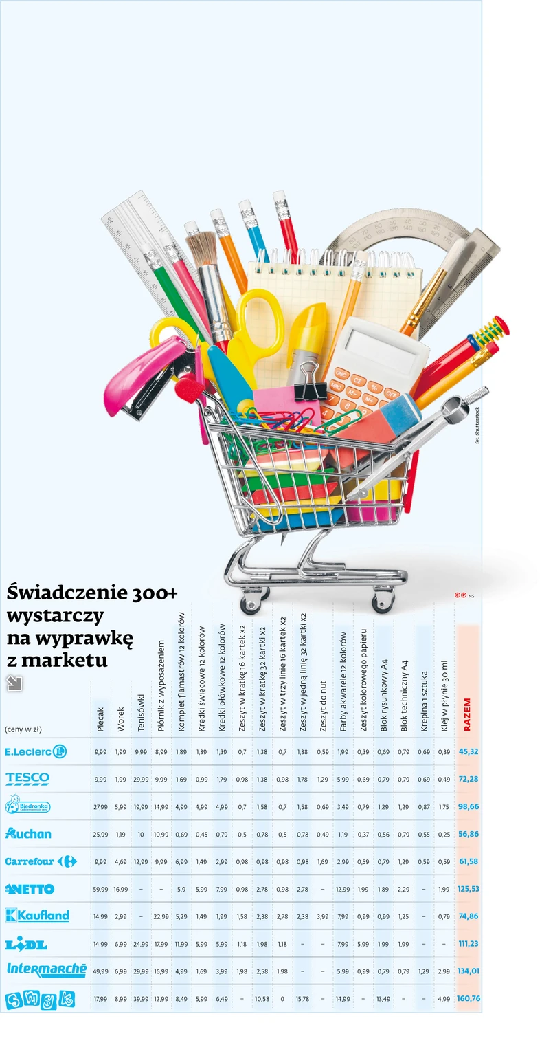 Od września naukę w szkole rozpocznie 4,6 mln dzieci. Wyposażenie ich w podręczniki, piórniki, długopisy, kredki i pozostałe niezbędne sprzęty jest co roku dla rodziców poważnym wyzwaniem finansowym. Jak wynika z dotychczasowych badań CBOS, co roku na ten cel wydawali ok. 600 zł na dziecko. Wypłacane od tego roku rządowe świadczenie 300 plus wystarczy więc na pokrycie połowy tych wydatków. Z analizy przeprowadzonej przez DGP wynika, że na zakup przyborów szkolnych i plecaka potrzeba od 45 do 160 zł. Kwota ta wzrośnie, gdy zdecydujemy się skompletować wyprawkę nie w jednej z popularnych sieci handlowych.