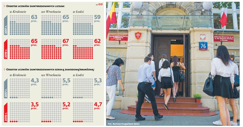 W Krakowie odsetek zainteresowanych liceami skoczył z 63 do 65 proc. między rokiem 2017 a 2019, we Wrocławiu z 65 do 67 proc. W Rzeszowie rok temu liceum cieszyło się popularnością wśród 50 proc. nastolatków, w tym roku już było ich 54 proc. W stolicy województwa kujawsko-pomorskiego było 47 proc., w tym roku jest 50 proc. W tym samym czasie spadała liczba chętnych do branżówek – dla przykładu w Krakowie z 4,2 do 3,5 proc., w Białymstoku z 5,9 do 5,1 proc. Również technika w większości miast cieszą się mniejszą popularnością – dla przykładu w stolicy Dolnego Śląska odsetek chętnych spadł z 29,2 do 27,6 proc., zaś w Rzeszowie z 48 do 43 proc.