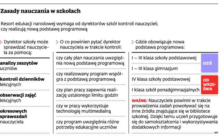 Według nowych przepisów dyrektor szkoły, a nie poszczególni nauczyciele, odpowiada za to, aby łączna suma zajęć z określonego przedmiotu w ciągu całego okresu kształcenia, np. w gimnazjum, wynosiła co najmniej tyle, ile przewiduje ramowy plan nauczania. Co więcej, również dyrektor odpowiada za efekty kształcenia z nowej podstawy programowej.