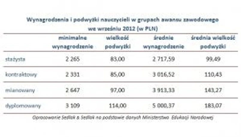 Wynagrodzenia polskich nauczycieli są na stosunkowo niskim poziomie w porównaniu z innymi krajami europejskimi. Jednak od 1 września 2012 roku sytuacja materialna pedagogów uległa nieznacznej poprawie. Podwyżki jakie otrzymali były ściśle powiązane ze szczeblem awansu zawodowego. W odniesieniu do wynagrodzeń zasadniczych nauczycieli z tytułem magistra i przygotowaniem pedagogicznym (95% ogółu) wyniosły one odpowiednio 83 PLN dla nauczyciela stażysty, 85 PLN kontraktowego, 97 PLN mianowanego i 114 PLN dyplomowanego. – Wynagrodzenie zasadnicze stanowi tylko jedną ze składowych wynagrodzenia nauczyciela. Przeciętne miesięczne wynagrodzenie belfrów według stopni awansu zawodowego kształtowało się na wyższym poziomie i wynosiło: w grupie nauczycieli stażystów 2 717,59 PLN, kontraktowych 3 016,53 PLN, mianowanych 3 913,33 PLN, dyplomowanych 5 000,37 PLN miesięcznie – komentuje Paweł Chorosz z Sedlak & Sedlak.