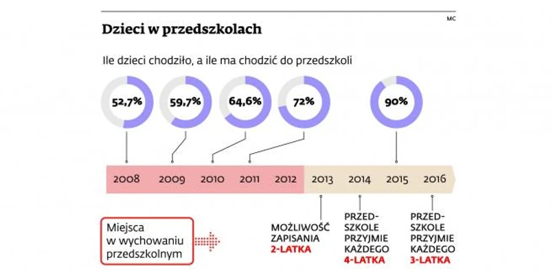 Jak wynika z obliczeń DGP, aby zgodnie z obietnicą minister Szumilas do przedszkoli poszło 90 proc. dzieci w wieku 3 – 5 lat, liczba miejsc w przedszkolach powinna się zwiększyć nawet o 200 tys. w porównaniu ze stanem obecnym. Resort zapowiedział, że stworzy 100 tys. MEN przekonuje, że resztę miejsc zapewni odejście sześciolatków, które pójdą do szkół. Takie założenia są nadmiernie optymistyczne. Wdrożenie w 2014 r. szkolnego obowiązku dla sześciolatków najpewniej się nie uda, bo w tym roku kumulują się duże roczniki dzieci.