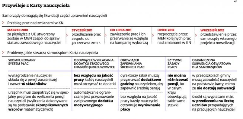 W marcu miną trzy lata od rozpoczęcia przez Ministerstwo Edukacji Narodowej (MEN) prac na zmianą Karty nauczyciela. Powoływane w tym czasie specjalne zespoły i zaproszeni do współpracy eksperci nie wypracowali dotąd żadnych rozwiązań. Maciej Jakubowski, wiceminister edukacji (obecny koordynator ze strony MEN w sprawie karty) pod koniec grudnia 2012 r. deklarował, że przedstawi oświatowym związkom i przedstawicielom samorządów projekt założeń do wspominanej ustawy. Grudniowe spotkanie jednak odwołano, a dokumentu nadal nie ma.
