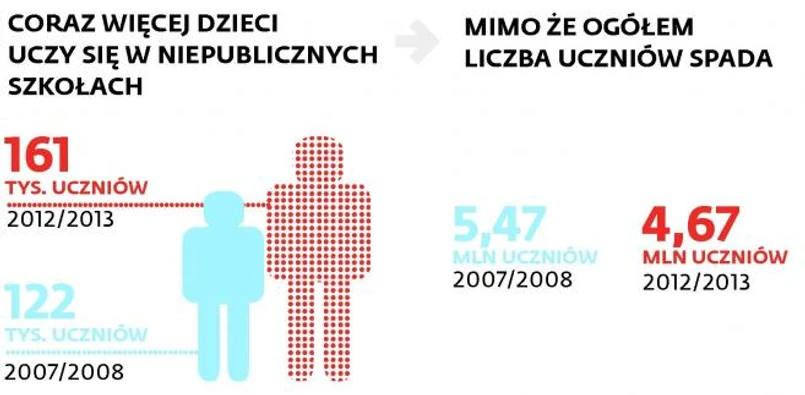 Mimo niżu demograficznego z roku na rok powstaje coraz więcej niepublicznych szkół. Kiedy pięć lat temu uczyło się w nich zaledwie 122 tys. uczniów, to dziś jest ich ponad 161 tys., i to mimo ogólnego spadku liczby dzieci w wieku szkolnym.