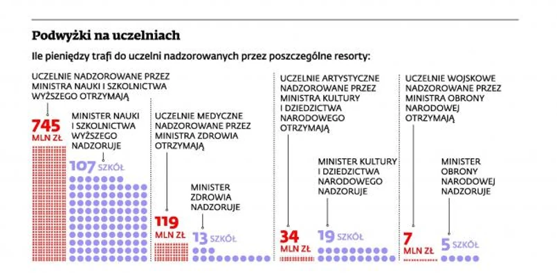 Obecnie wiadomo jedynie, ile pieniędzy trafi do poszczególnych typów szkół wyższych. Środki te zostaną podzielone przez resorty, które je nadzorują. Uczelnie artystyczne otrzymają 34 mln zł, a te, które podlegają pod resort nauki, ponad 700 mln zł. Jednak dopóki minister finansów nie uwolni środków z rezerwy celowej, na konta uczelni nie zostaną przelane żadne pieniądze.