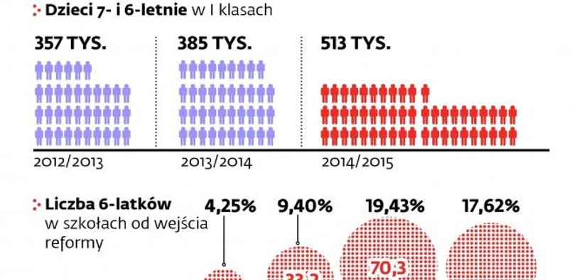 Od 2014 r. do szkół ma pójść – zgodnie z najnowszą obietnicą premiera Donalda Tuska – obowiązkowo tylko połowa rocznika 6-latków, czyli 203 tys. dzieci. Choć odsuwa to groźbę „szkolnego tsunami”, to jak wynika z naszych wyliczeń, i tak w I klasach będzie więcej dzieci.