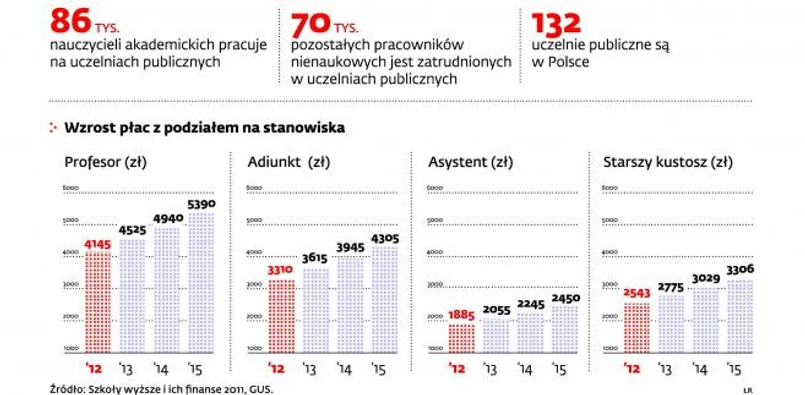 Wzrost minimalnych stawek pensji określa rozporządzenie ministra nauki i szkolnictwa wyższego z 5 października 2011 r. w sprawie warunków wynagradzania za pracę i przyznawania innych świadczeń związanych z pracą pracowników zatrudnionych na uczelni publicznej (Dz.U. nr 243 poz. 1447). Zgodnie z nim np. płaca osoby zatrudnionej na stanowisku wykładowcy ma wzrosnąć z 1830 zł w 2012 do 2375 zł w 2015 r. Przepisy narzucają jednak tylko podwyżki minimalnych stawek wynagrodzenia.