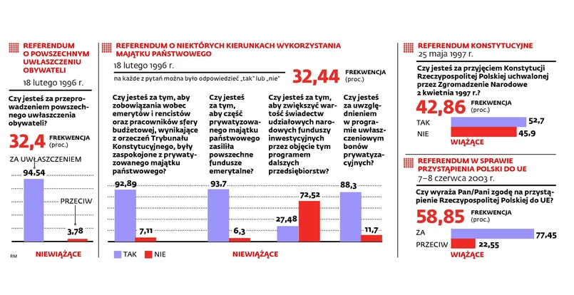 Historia polskich referendów pokazuje, że udały się jedynie dwa, i to organizowane w szerokim politycznym porozumieniu, dotyczące najważniejszych kwestii: w 1997 r. zatwierdzające konstytucję i w 2003 r., dotyczące członkostwa Polski w UE.