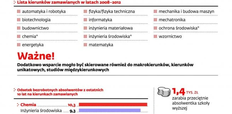 Resort nauki chce pozyskać dodatkowe pieniądze na dofinansowanie kierunków zamawianych (technicznych, matematycznych, przyrodniczych) jeszcze w tym roku. Okazuje się jednak, że część z tych, które znajdują się na liście dotowanych do tej pory, nie zapewniły ich absolwentom pracy. Zdaniem ekspertów resort nauki powinien co roku aktualizować ich wykaz, a nie opierać się na danych uzyskanych pięć lat temu.