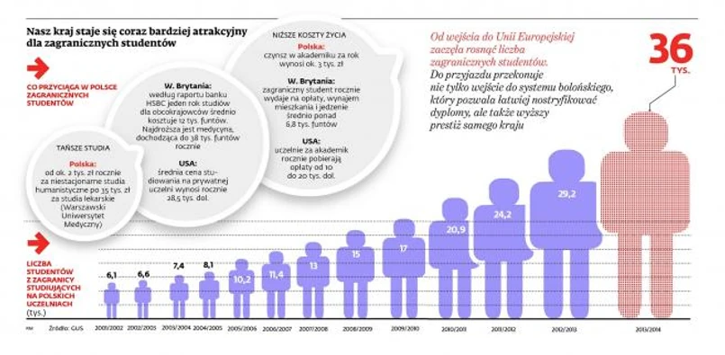 Większość osób przyjeżdżających do nas na studia to Białorusini (3,7 tys.) i Ukraińcy (ponad 15 tys.). Ale od kilku lat widać też rosnące zainteresowanie Polską jako kierunkiem edukacyjnym wśród Skandynawów (łącznie jest ich już blisko 3 tys.) i Hiszpanów (ponad 1,3 tys.). Pierwszy większy skok wśród tych grup narodowościowych zaobserwowano po naszym wejściu do Unii Europejskiej, drugi – wraz z początkiem kryzysu gospodarczego. Właśnie dzięki wejściu do Unii i do wspólnego bolońskiego systemu ocen wyższej edukacji polskie