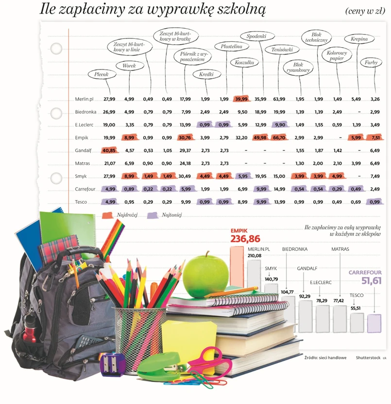 Najkorzystniej w przygotowanej przez DGP analizie pod względem cen produktów wchodzących w skład wyprawki wypadły właśnie sieci Carrefour i Tesco. Pobiły nie tylko rywali z rynku tradycyjnego, ale i internetowego. W E.Leclerc za taką samą wyprawkę szkolną trzeba zapłacić o 20 zł więcej, a w Biedronce prawie dwa razy tyle.