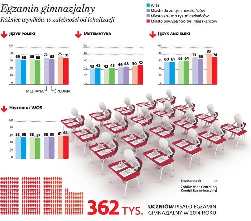 Za zadania na egzaminie z języka polskiego uczeń z miasta powyżej 100 tys. mieszkańców dostawał w 2014 r. średnio 71 proc. możliwych do zdobycia punktów. Gimnazjalista ze wsi – 66. Za arkusz sprawdzający umiejętności matematyczne odpowiednio: 52 i 45 proc., a za część przyrodniczą – 55 i 51 proc. Największą różnicę widać jednak w testach z języków, szczególnie angielskiego – między uczniami ze wsi i z dużych miast jest aż 13 pkt proc. różnicy. Na korzyść tych drugich. Statystyczna przepaść pogłębia się, jeśli pod uwagę weźmiemy nie średnią wyników, a medianę – wtedy różnica wyniesie ponad 20 pkt proc. Nierówności dokładnie widać w sprawozdaniu z wyników egzaminu gimnazjalnego, które opublikowała właśnie Centralna Komisja Egzaminacyjna.