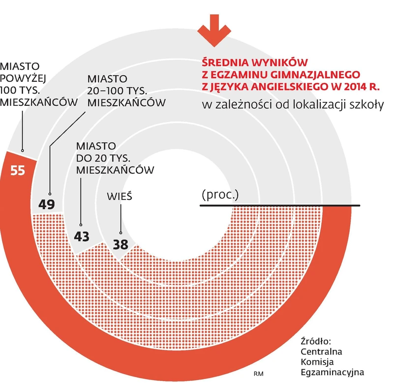 Jak wyjaśnia Marcin Smolik, szef Centralnej Komisji Egzaminacyjnej, uczniowie ze wsi dużo gorzej wypadli już w pilotażowych sprawdzianach prowadzonych między 2010 a 2012 r. A po raz pierwszy ogromne dysproporcje w tej kwestii między miastem a wsią pokazały wyniki egzaminów gimnazjalnych. Na przykład w 2009 r. uczniowie ze wsi zdobywali średnio 28 punktów na 50 możliwych, a ci z miast liczących więcej niż 100 tys. mieszkańców – 34 punkty.