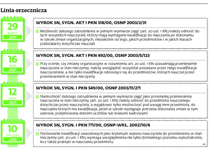 Sądy przywróciły nauczycielkę do pracy. Stwierdziły, że na skutek okrojenia budżetu poradnia nie miała możliwości dalszego zatrudniania w pełnym wymiarze godzin trzech logopedów, a więc wskazana przyczyna zwolnienia (restrukturyzacja zatrudnienia) była konkretna i prawdziwa oraz pozwalała na rozwiązanie z nauczycielką stosunku pracy na podstawie art. 20 ust. 1 pkt 2 i 5c ustawy z 26 stycznia 1982 r. – Karta Nauczyciela (t.j. Dz.U. z 1997 r. nr 56, poz. 357 ze zm.; dalej: KN). Jednak przyjęte przez pracodawcę kryteria doboru nauczycielki do zwolnienia, tj. niższe kwalifikacje zawodowe w porównaniu z pozostałymi logopedami i krótszy staż pracy na stanowisku logopedy, były niewystarczające, skoro pracownica poza uprawnieniami logopedy miała również uprawnienia pedagoga. Odniesienie tych kryteriów doboru do pedagogów zatrudnionych w poradni nie uzasadniałoby raczej wypowiedzenia stosunku pracy właśnie tej pracownicy.
