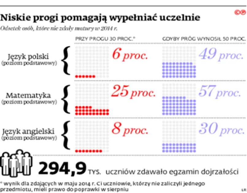 Z szacunków DGP wynika z kolei, że gdyby próg zdawalności matury wynosił 50 proc., potknęłaby się o niego większość maturzystów. 49 proc. nie poradziłoby sobie z maturą z języka polskiego, 57 proc. nie zdałoby matematyki. Najlepiej poszłoby na angielskim – ten przedmiot na poziomie podstawowym oblałoby 30 proc. maturzystów.