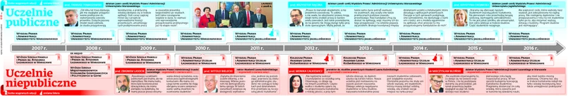 Nie tylko metodologia ulegała modyfikacjom. W ciągu ostatniej dekady zmieniali się też liderzy. Ale wiarygodność naszego rankingu potwierdza fakt, że walka o podium toczyła się między tymi samymi faworytami. W przypadku uczelni publicznych: Uniwersytetem Warszawskim a Jagiellońskim, czy niepublicznych: Uczelnią Łazarskiego a Akademią Leona Koźmińskiego (patrz infografika). Nigdy nie było takiej sytuacji, aby co roku diametralnie zmieniała się pierwsza trójka najlepszych wydziałów. Dynamika zmian w szkolnictwie wyższym na taką zmienność – jak się okazuje – po prostu nie pozwala. Nawet sukcesywne, ale też nie radykalne dodawanie nowych parametrów nie zachwiało rzetelną oceną szkół wyższych.