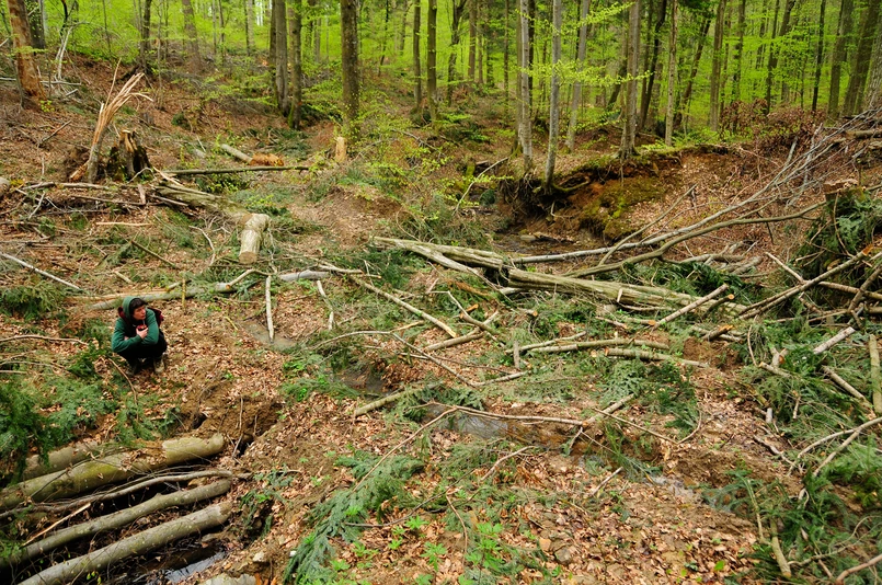 Na leśne tereny, które znajdują się pod rządami Nadleśnictwa Bircza przyjeżdżam 7 maja 2021 r. To drugi tydzień „okupacji” wjazdu do lasu przez społeczną Inicjatywę Dzikie Karpaty. Przydrożne place służące do gromadzenia ściągniętego z lasu drewna toną w błocie. To nie tylko efekt silnych opadów, które miały tam miejsce w ostatnich dniach. Woda z powodu dróg zrywkowych nie zatrzymuje się w lesie i nie jest powoli wchłaniana przez ściółkę, lecz pędzi wartkim strumieniem wzdłuż gigantycznych koryt i zatrzymuje się dopiero na płaskim terenie lub wpada do strumieni.