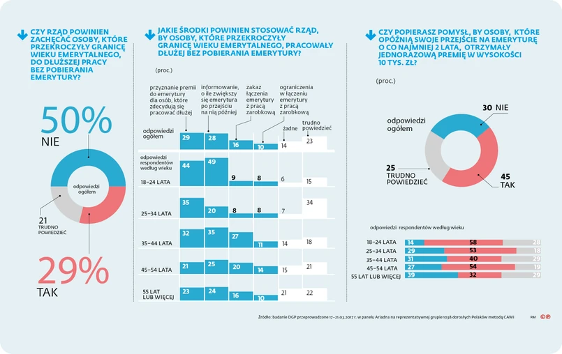 Największym zainteresowaniem takie rozwiązanie cieszy się w dwóch grupach wiekowych: najmłodszej 18–24 lata (58 proc. poparcia) oraz średniej 45–54 lata (54 proc. opowiedziało się za). Poparcie w starszej grupie można wytłumaczyć pragmatyzmem odnośnie do najbliższej przyszłości. To grupa, która pracuje, której nie zostało już dużo do emerytury, natomiast słyszy coraz częściej o tym, że świadczenia będą niskie. Z tego punktu widzenia premia może się wydawać czymś opłacalnym. Poparcie w grupie najmłodszej można tłumaczyć tym, że to osoby albo jeszcze niepracujące lub pracujące z reguły na umowach śmieciowych, a także często zwolnione z płacenia składki. W ich przypadku nie widać związku między pracą a emeryturą, natomiast 10 tys. zł w ręku wydaje się im czymś konkretnym.