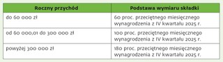 Wysokość stawki procentowej zależy od wysokości osiągniętego przychodu, natomiast sama składka wynosi 9 proc. ustalonej w ten sposób podstawy.