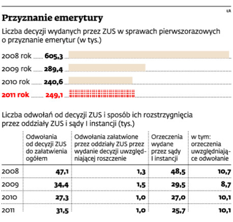 W 2011 roku Zakład Ubezpieczeń Społecznych wydał 249,1 tys. decyzji emerytalnych. Odwołało się od nich 31,5 tys. osób. Co trzecia z nich wygrała sprawę w sądzie.