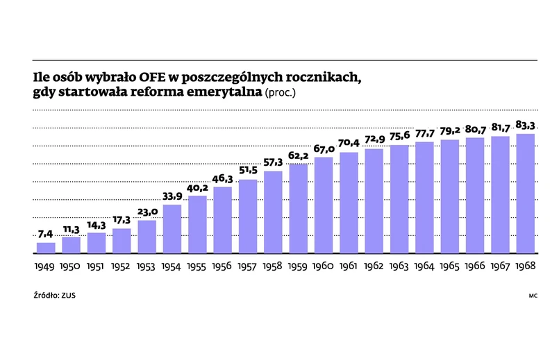 W efekcie na starcie od 15 do 25 proc. obecnych klientów OFE znajdzie się w ZUS. Do tego, jak wskazują dane z samych OFE, cztery piąte nowych klientów jest rozlosowywana, więc pokaźna grupa klientów OFE może nawet nie zwrócić uwagi, że trafi do państwowego ubezpieczyciela. Jeśli przepisy dotyczące pozostawania w OFE będą jeszcze bardziej restrykcyjne, np. wymagane będzie osobiste stawiennictwo w ZUS – odsetek osób, które znajdą się w zakładzie, automatycznie wzrośnie.