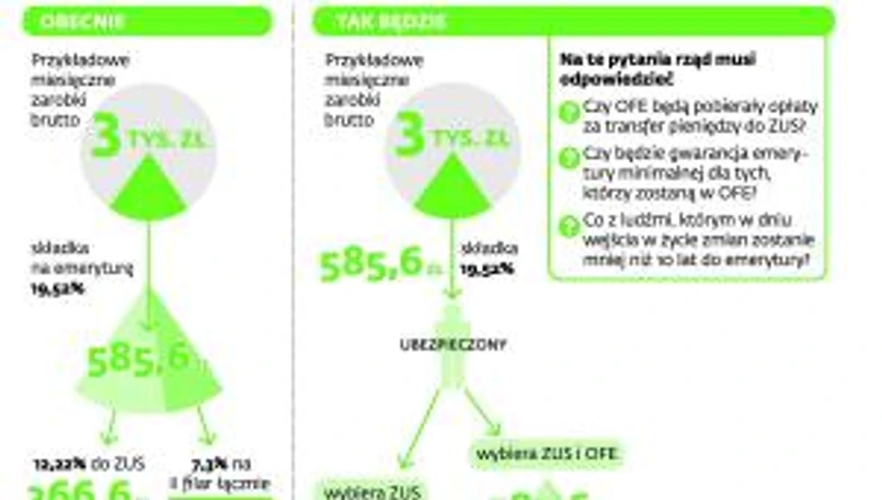 Obecnie osoba obowiązkowo oszczędzająca w II filarze każdego miesiąca na przyszłą emeryturę przekazuje 7,3 proc. Z tego jednak do OFE trafia tylko część środków. W tym roku jest to 2,8 proc., w przyszłym zaś wielkość ta powinna wzrosnąć do 3,1 proc. Tak się jednak nie stanie. Rząd bowiem chce ograniczyć do 2,92 proc. podstawy wymiaru kwotę przekazywaną do OFE. Wpłacanie składki do otwartych funduszy nie będzie także obowiązkowe.