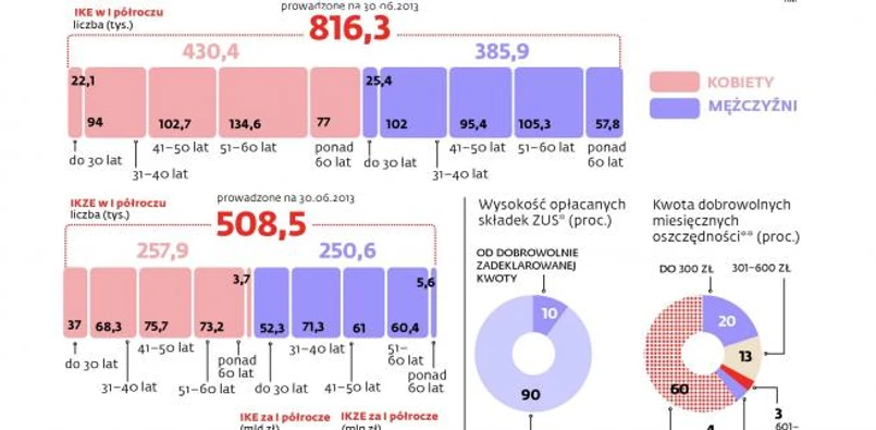 W pierwszym półroczu tego roku średnie wpłaty na IKE wyniosły 2,1 tys. zł, czyli 350 zł miesięcznie. Na IKZE już jedynie 700 zł, co daje nieco ponad 116 zł miesięcznie.