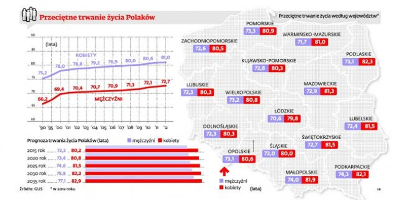 Nasze życie wydłuża się w znacznie szybszym tempie, niż zakładał GUS. Przewidywana długość życia Polaka urodzonego w 2012 r. wyniesie 72,7 roku, Polki – 81 lat. Według prognoz demografów takiego wieku mieli dożywać mężczyźni urodzeni po 2015 r., a kobiety po 2020 r. To martwi urzędników ZUS i NFZ. Trzeba będzie więcej pieniędzy na emerytury i opiekę nad starszymi. W prognozach demograficznych GUS nie przewidziano tak dynamicznych zmian.