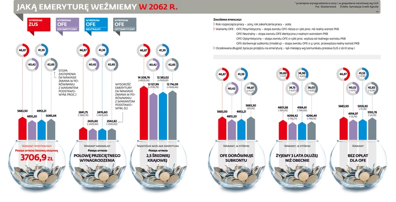 Symulację wykonano w cenach z 2015 r. biorąc pod uwagę realny wzrost PKB i wzrost płac. Okazuje się, że osoba zarabiająca przeciętne wynagrodzenie przez całą pracę zawodową dostanie emeryturę wartą od 4900 zł do niemal 5700 zł w zależności od tego, czy jej składka trafi do OFE, czy do ZUS. Z kolei najniższa emerytura w 2062 r. będzie nawet o 2800 zł niższa od przeciętnej. A najwyższa będzie aż o ponad 8,5 tys. większa od przeciętnej. To liczby, które na pewno robią wrażenie, ale warto pamiętać, że dotyczą roku 2062. Czyli niemal półwiecza wzrostu gospodarki i podwyżek wynagrodzeń. Sytuacja się zmienia, gdy odniesiemy je do ówczesnych pensji. Bo stopa zastąpienia, czyli relacja emerytury do ostatniej pensji, wynosi w symulacji Credit Agricole od 40 do 47 proc. Podczas gdy dziś jest znacznie wyższa i wynosi ponad 60 proc.