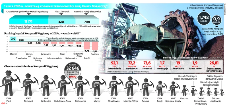 Od lipca tego roku w strukturach PGG będą działać kopalnie zespolone. Samodzielność zachowają tylko Bolesław Śmiały (być może zostanie sprzedany Tauronowi) i najsłabsza w strukturach KW Sośnica (być może zostanie zamknięta). Pozostałe zakłady połączone zostaną w trzy megakopalnie. Będą to: Halemba-Pokój-Bielszowice, Piast-Ziemowit oraz Chwałowice-Jankowice-Marcel-Rydułtowy. W porozumieniu czytamy, że w wyniku łączenia powstanie zbędny majątek, który zostanie przekazany do SRK, co daje nadzieję na kolejne oszczędności.