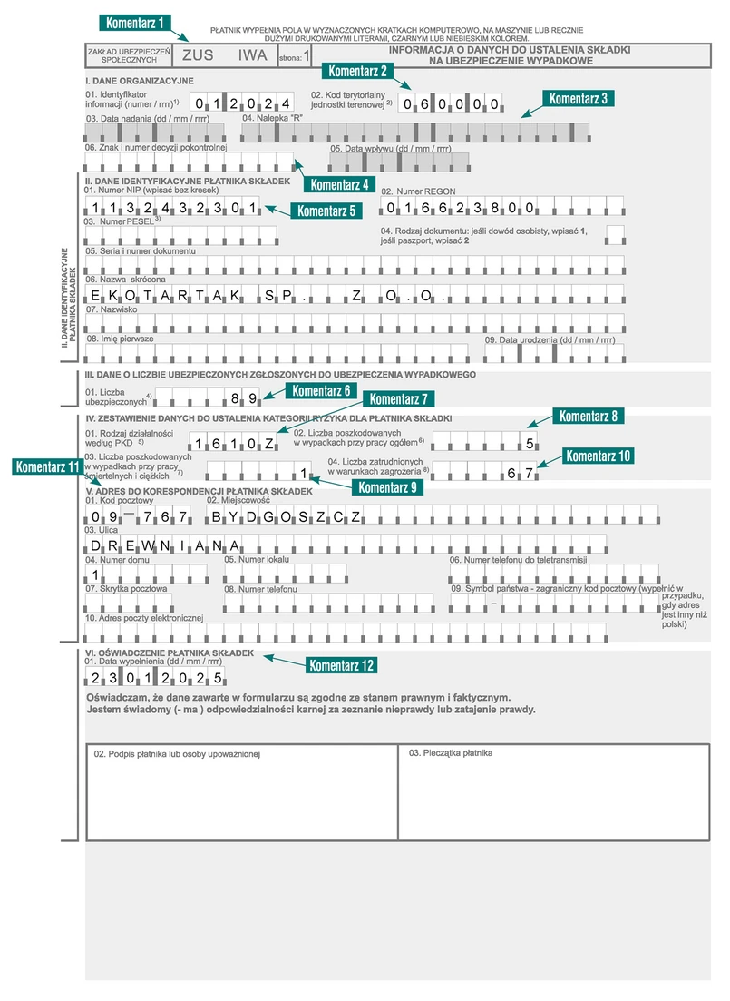 Informacja ZUS IWA składa się z 7 bloków, z których płatnik składek wypełnia 6 (ostatni blok to adnotacje ZUS).