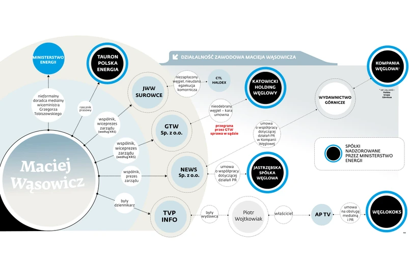 Obsługa medialna to niejedyny zarobek Wąsowicza w górnictwie. Jeszcze jako dziennikarz TVP Info po prostu... handlował węglem – w tym np. z Tauronu Wydobycie. W KRS figuruje jako udziałowiec i wiceprezes firm GTW i JWW Surowce. Nam mówi, że obecnie nie pełni w nich żadnych funkcji, choć według KRS z 27 stycznia br. (ostatni piątek) jest wiceprezesem zarządu obu spółek oraz ich udziałowcem.