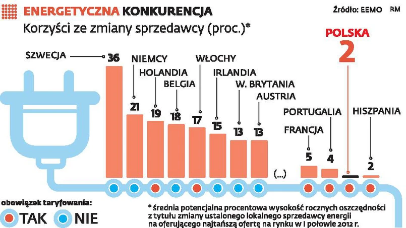 Zmieniając dostawcę, Szwed jest w stanie obniżyć roczne wydatki na prąd o 36 proc., Niemiec – o 21 proc. Na czele zestawienia są jeszcze Holandia (19 proc.), Belgia (18 proc.), Włochy (17 proc.) oraz Wielka Brytania (13 proc.). Na drugim biegunie znalazły się Hiszpania (2 proc.), Portugalia (4 proc.) oraz Francja (5 proc.).