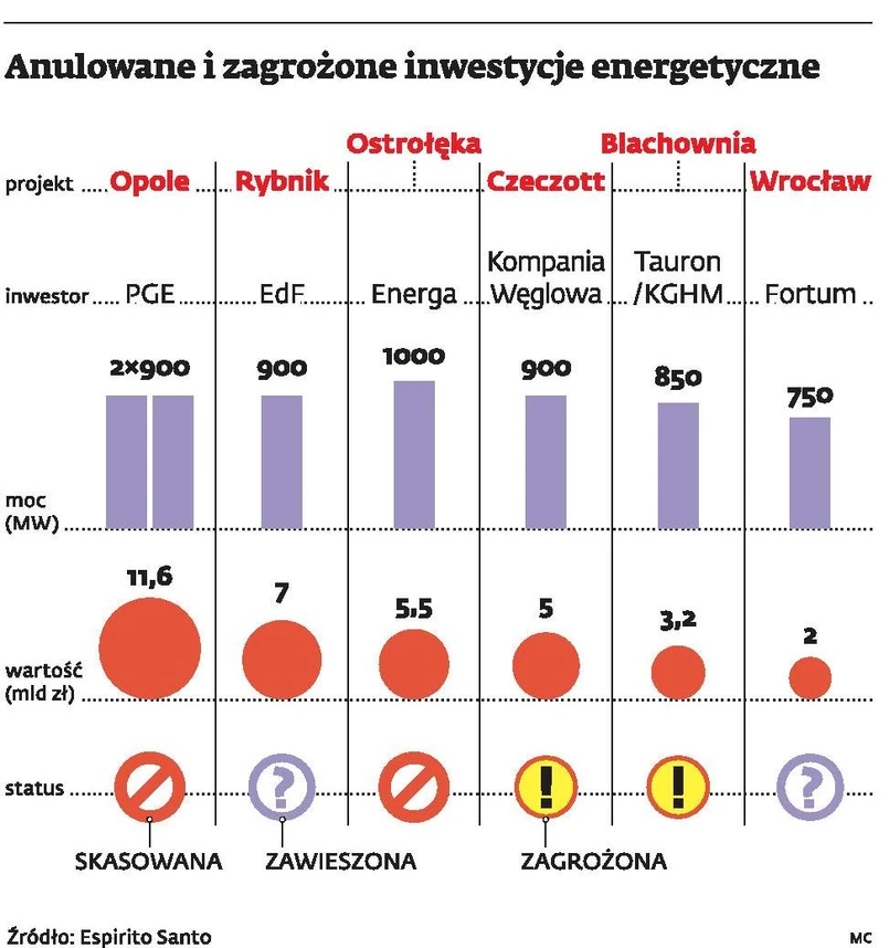 Dziś dojdzie do pierwszego spotkania przedstawicieli PGE z członkami konsorcjum wykonawczego niedoszłej inwestycji w Opolu. Nastąpi to kilkanaście dni po tym, jak PGE poinfomowała o rezygnacji z budowy dwóch węglowych bloków. Do Bełchatowa, gdzie odbęda się rozmowy, wybiera się Paweł Mortas, prezes Rafako, który razem z Polimeksem-Mostostalem i Mostostalem Warszawa miał budować obiekt. Jak ustalił DGP, podczas tego spotkania PGE oficjalnie poinformuje go o anulowaniu planów budowy siłowni o mocy 1800 MW za 11,6 mld zł.