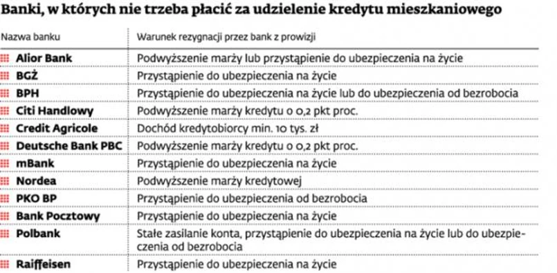 Np. w BGŻ, mBanku, Banku Pocztowym, Raiffeisenie, Alior Banku, BPH i Polbanku klient zaoszczędzi na prowizji, gdy ubezpieczy się na życie, korzystając z oferty banku. W kilku kolejnych zamiast się ubezpieczać na wypadek śmierci, można skorzystać z innej oferty. W Aliorze jest to podwyższenie marży. A w BPH i Polbanku polisę na życie można zastąpić ubezpieczeniem od bezrobocia. Polisa od utraty pracy wystarczy do rezygnacji z prowizji również w PKO BP. W kilku instytucjach można uzyskać taką samą korzyść, godząc się na podwyższenie marży. Z reguły podwyżka wynosi 0,2 pkt proc. Tak jest w Citi Handlowym, Deutsche Banku PBC, Nordea Banku. Credit Agricole rezygnuje z prowizji od klientów, których miesięczne dochody przekraczają 10 tys. zł.