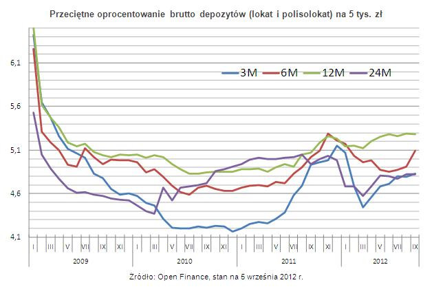 Średnie oprocentowanie półrocznych depozytów wyliczanych dla 35 banków wynosi 4,83 proc. i jest o 0,04 p.p. wyższe niż przed miesiącem. Lokaty półroczne dają przeciętnie zarobić 5,09 proc. czyli o 0,18 p.p. więcej niż w sierpniu – to największy wzrost w ujęciu miesięcznym od lipca 2009 roku. Wówczas był to tylko jednorazowy wyskok, a w kolejnych miesiącach banki obniżały odsetki. Roczne depozyty przynoszą średnio 5,28 proc. zysku (-0,01 p.p.), a na przeciętnej lokacie dwuletniej można zarobić 4,82 proc., dokładnie tyle co przed miesiącem.