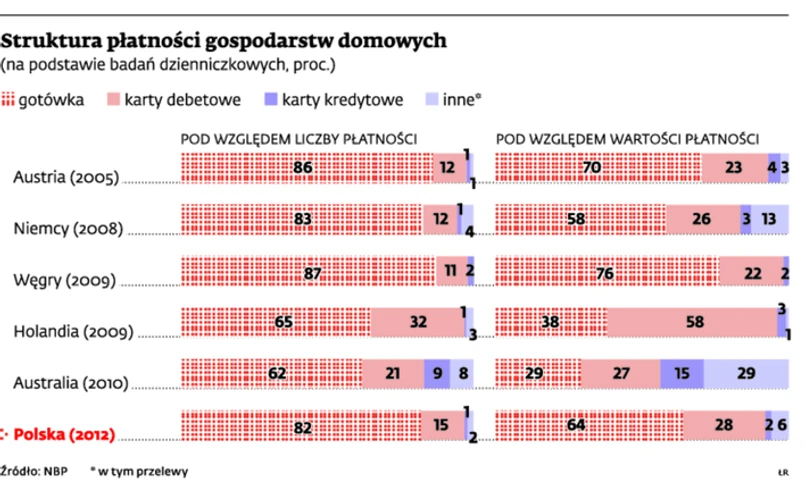 Obecnie wypłacanie pieniędzy z bankomatów to najbardziej popularny wśród Polaków sposób korzystania z kart płatniczych. W sklepach nadal najchętniej płacimy gotówką. Z przeprowadzonych w ubiegłym roku przez Narodowy Bank Polski tzw. dzienniczkowych badań struktury płatności wynika, że gotówkowo regulujemy 82 proc. płatności (w ujęciu wartościowym jest to 64 proc.).