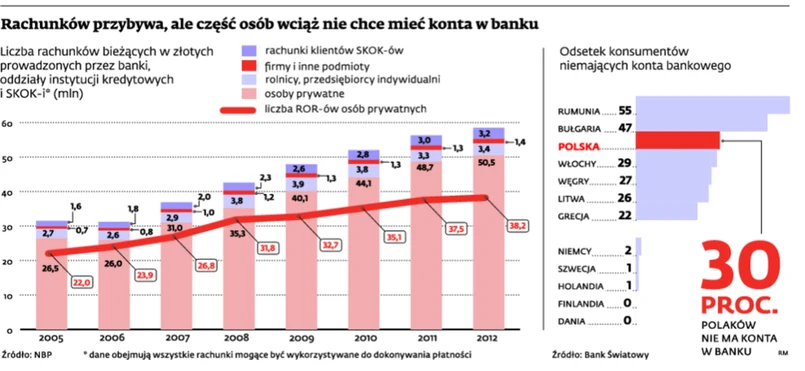 Korzystanie z instytucji finansowych jest jeszcze bardziej powszechne, jeśli posłużyć się liczbą rachunków bieżących (obejmujących np. konta oszczędnościowe, które – podobnie jak ROR-y – pozwalają na dokonywanie przelewów). Sami klienci indywidualni mieli w końcu 2012 r. 50,5 mln tego typu kont. A jeśli dodać do tego niemal 3,2 mln rachunków członków spółdzielczych kas oszczędnościowo-kredytowych, 3,4 mln kont prowadzonych przez banki dla rolników i prywatnych przedsiębiorców oraz 1,4 mln kont dla firm i innych podmiotów, okazuje się, że w sumie banki prowadziły w końcu minionego roku 58,5 mln rachunków bieżących, o ponad 2,1 mln więcej niż rok wcześniej.