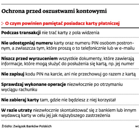 Przed oszustwami kartowymi lub kradzieżą może uchronić przestrzeganie kilku prostych zasad. Posiadacz (użytkownik) karty płatniczej jest zobowiązany do przechowywania karty płatniczej i ochrony kodu identyfikacyjnego z zachowaniem należytej staranności. Nie może on przechowywać karty razem z kodem identyfikacyjnym (PIN-em, numerem, hasłem) i nie może udostępniać go osobom nieuprawnionym. W razie utraty lub zniszczenia karty płatniczej musi on najwcześniej jak jest to możliwe, zgłosić ten fakt wydawcy karty. Wszystkie wymienione powinności to nie tylko ale, obowiązki wynikające z art. 16 ust. 1 ustawy o elektronicznych instrumentach płatniczych. Przestrzeganie powyższych zasad w znacznym stopniu chroni przed niedogodnościami i kłopotami, jakie powodują oszustwa kartowe.