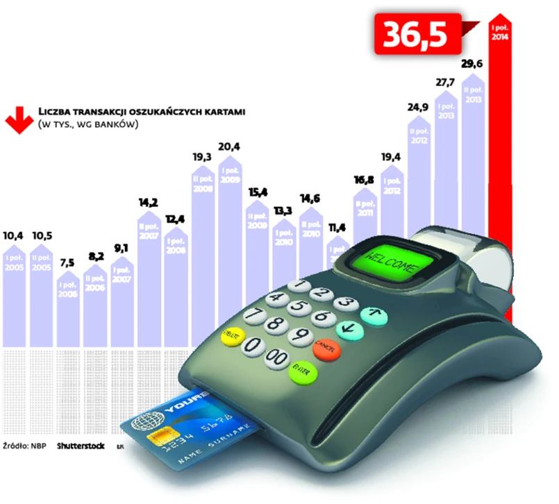 O dynamicznym wzroście oszukańczych transakcji kartami informuje raport Narodowego Banku Polskiego na temat oceny funkcjonowania systemu płatniczego w I poł. 2014 r. Dokument nie jest jeszcze oficjalnie dostępny, ale został zaprezentowany podczas posiedzenia działającej przy NBP Rady ds. Systemu Płatniczego. Zgodnie z nim w okresie od stycznia do końca czerwca tego roku złodzieje dokonali bez mała 36,5 tys. kradzieży przy wykorzystaniu kart bankowych. To niewiele w stosunku do wszystkich transakcji kartami, których tylko w II kw. tego roku było ponad 643 mln. Niepokoić może jednak dynamika wzrostu oszustw. W stosunku do II poł. ubiegłego roku przybyło ich aż o ponad 23 proc.