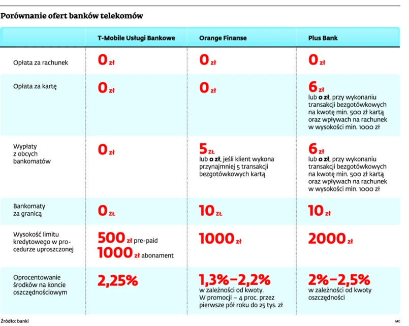 Z kolei T-Mobile kasuje konkurencję pod względem opłat za korzystanie z bankomatów. Wszystkie urządzenia w kraju i za granicą są bezpłatne. W Orange Finanse bankomaty w kraju są za darmo dopiero wtedy, gdy klient wykona transakcje bezgotówkowe kartą na min. 500 zł. W przeciwnym razie trzeba płacić miesięczną prowizję 5 zł. Wypłata gotówki z maszyny za granicą to wydatek 10 zł każdorazowo. Tyle samo kosztuje to w Plus Banku, który dodatkowo każe sobie płacić za wypłaty z obcych bankomatów. Opłat mogą uniknąć klienci wykazujący się odpowiednią aktywnością.