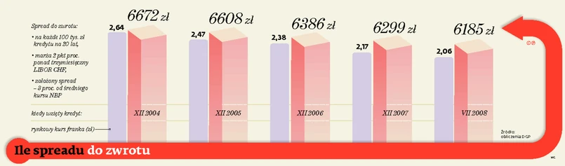 Przeanalizowaliśmy, ile spready kosztowały przykładowych klientów, którzy brali 20-letnie kredyty w poszczególnych momentach boomu, jaki miał miejsce przed kryzysem. Pod uwagę wzięliśmy kredyty zaciągnięte pod koniec kilku kolejnych lat pomiędzy 2004 a 2007 r. oraz w sierpniu 2008 r., kiedy kurs franka wobec złotego był najwyższy. Zakładając, że spread wynosił 3 proc. (czyli że taka była różnica zarówno między kursem kupna, jak i sprzedaży waluty w stosunku do średniego kursu NBP; nierzadko spready były wyższe, a część banków stosowała spready „niesymetryczne” – gdy miały dużo wypłat kredytów, kurs kupna franków przesuwały w dół, a gdy zaczęły dominować spłaty, podwyższały kurs sprzedaży waluty), na każde 100 tys. zł zadłużenia przypada od niemal 6,2 tys. zł dla kredytów z sierpnia 2008 r. do prawie 6,7 tys, zł – w przypadku kredytów z końca 2004 r. 3 tys. to spread walutowy zapłacony przez klienta w momencie zaciągnięcia kredytu, resztę banki pobrały w okresie spłaty. Dopiero w ostatnich latach spreadu można było uniknąć, kupując walutę taniej w kantorze i spłacając kredyt bezpośrednio we frankach.