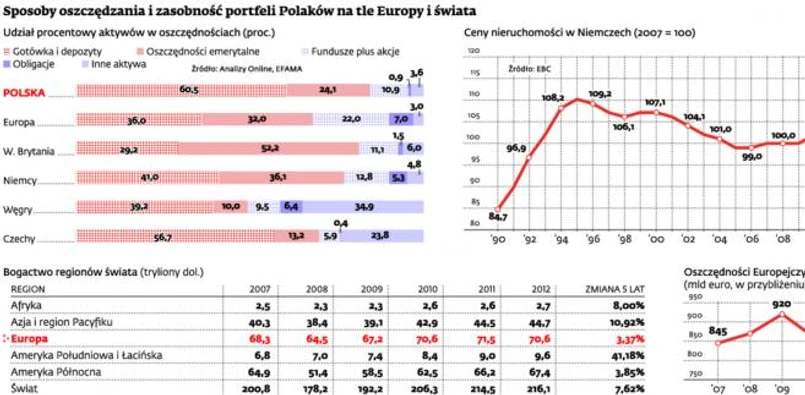 – Z tego powodu mimo spadku nominalnej wartości oszczędności posiadanych przez europejskie gospodarstwa domowe wartość zgromadzonego przez nie bogactwa pozostaje mniej więcej na tym samym poziomie co przed kryzysem finansowym – zwraca uwagę dyrektor działu analiz EFAMA Bernard Delbecque. Wynika to nie tylko z raportu EFAMA, lecz także z tegorocznego raportu o stanie światowego bogactwa autorstwa ekspertów Credit Suisse. Według tego dokumentu bogactwo Europy wzrosło w ciągu ostatnich 5 lat o 3,4 proc. Tym niemniej przez kryzys w strefie euro pozostałe kontynenty wzbogaciły się bardziej, a najbardziej Ameryka Południowa (o 41 proc.). Trzeba jednak zaznaczyć, że to właśnie w Europie jest najwięcej bogactwa (o wartości 71,5 tryliona dol.), więcej nawet niż w Ameryce Północnej (66,2 tryliona dol.).