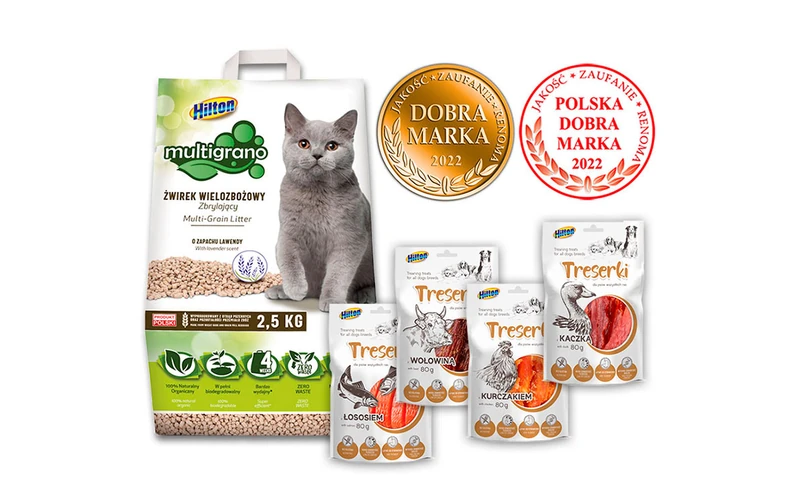 Dobrym wyborem w zakresie akcesoriów dla zwierząt są produkty polskiej marki Hilton. Brand istnieje od ponad 30 lat i, co istotne, cały czas poszerza swój asortyment. W jego portfolio znajdziemy ponad 200 artykułów przeznaczonych dla psów i kotów, tj. żwirki (bentonitowe, drewniane i silikonowe), przysmaki i przekąski (treserki, kości, gryzaki), zabawki, produkty higieny (szampony, szczotki), smycze, obroże, legowiska oraz akcesoria dodatkowe (kuwety, łopatki, transportery, miski). Dzięki zróżnicowanej ofercie oraz wysokiej jakości produktów Hilton jest jednym z najbardziej rozpoznawalnych brandów w branży i skutecznie konkuruje z zagranicznymi koncernami. Ogromnym atutem polskiej marki jest również jej dostępność, możemy ją spotkać w sklepach zoologicznych oraz popularnych marketach. Dzięki m.in. tym atutom artykuły z logo Hilton zostały w tym roku wyróżnione tytułami Dobra Marka 2022 – Jakość, Zaufanie, Renoma oraz Polska Dobra Marka 2022 – Jakość, Zaufanie, Renoma.
