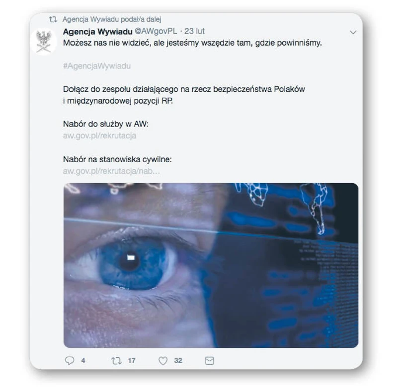 Gdy AW uruchamiała swój profil na Twitterze w grudniu 2017 r. i zamieszczała tam nagrania wideo oraz ogłoszenia o rekrutacji, spotkała się z prześmiewczymi komentarzami. Jednak analiza obecności agencji wywiadowczych na świecie w mediach społecznościowych pokazuje, że to dzisiaj standard w pozyskiwaniu analityków, tłumaczy czy oficerów operacyjnych. Służby na całym świecie borykają się z problemami kadrowymi. Nie rezygnują z wyszukiwania kandydatów, którzy odpowiadają ich potrzebom, i pukają do ich drzwi, ale także prowadzą nabór na Twitterze, Facebooku, przez YouTube’a, a nawet ogłoszenia w prasie.