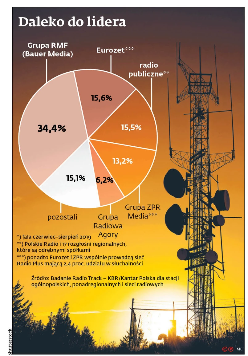 Według najnowszego badania Radio Track za okres czerwiec-sierpień br. RMF FM, RMF Classic i RMF Maxxx mają łącznie ponad 34 proc. udziału w czasie słuchania, przy czym znaczną większość tego wyniku wypracowuje antena ogólnopolska. Słuchalność stacji Eurozetu jest o ponad połowę mniejsza. Ale połączone siły wicelidera rynku i Agory dają już prawie 22 proc. słuchalności.
