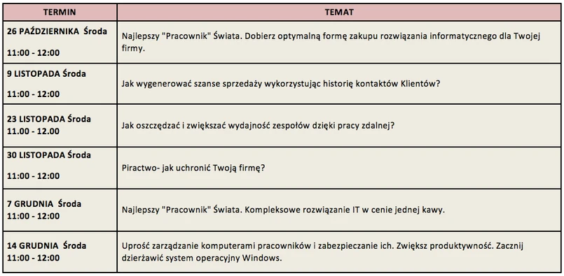 Warsztaty będą odbywać się w wybrane środy, przez cały rok. Będą prowadzone przez ekspertów Microsoft, jak również specjalistów z danych dziedzin, którzy pokażą krok po kroku, jak w łatwy i szybki sposób stworzyć materiały marketingowe bez pomocy grafika, wygenerować nowe szanse sprzedaży bez angażowania w to dodatkowych środków finansowych, zaoszczędzić dzięki zdalnej formie pracy, jak uchronić firmę od piractwa, czy jakie formy licencjonowania są najbardziej efektywne kosztowo.