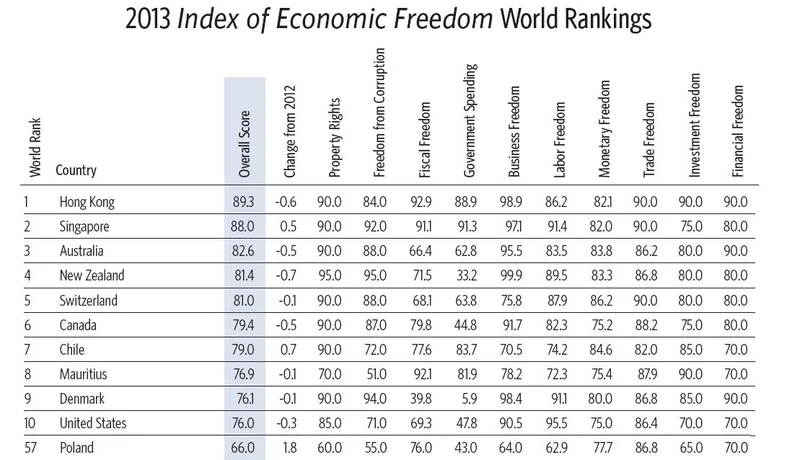 Polska osiągnęła lepszy wynik w porównaniu do 2012 r. o 1,8 pkt otrzymując łącznie 66 punktów. Poprawa nastąpiła m.in. w łatwości prowadzenia biznesu. Swoboda handlu jest bardzo dobre oceniana - zajmujemy tutaj 11 pozycję na świecie. W obszarach praw własności oraz poziomu korupcji zajęliśmy odpowiednio 42 i 40 lokatę.