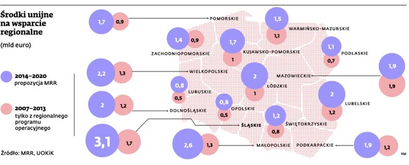 Limit pomocy publicznej obejmuje także wsparcie unijne. To oznacza, że dotacje dla pojedynczych firm będą mniejsze niż w obecnej perspektywie finansowej. Tymczasem w nowej perspektywie środki przekazywane regionom na programy operacyjne będą większe. To oznacza, że wsparcie będzie musiało trafić do większej niż poprzednio liczby firm. A chętnych aż tak wielu nie ma. Jak wynika z ankiety Instytutu Badań i Analiz oraz portalu Firmy.net, tylko 14,2 proc. małych i średnich przedsiębiorstw deklaruje chęć sięgnięcia po środki z UE w nowym rozdaniu. – Aby zwiększyć zainteresowanie przedsiębiorców, Ministerstwo Rozwoju Regionalnego będzie prowadziło kampanie promujące fundusze europejskie 2014–2020 – deklaruje Piotr Popa, rzecznik MRR.
