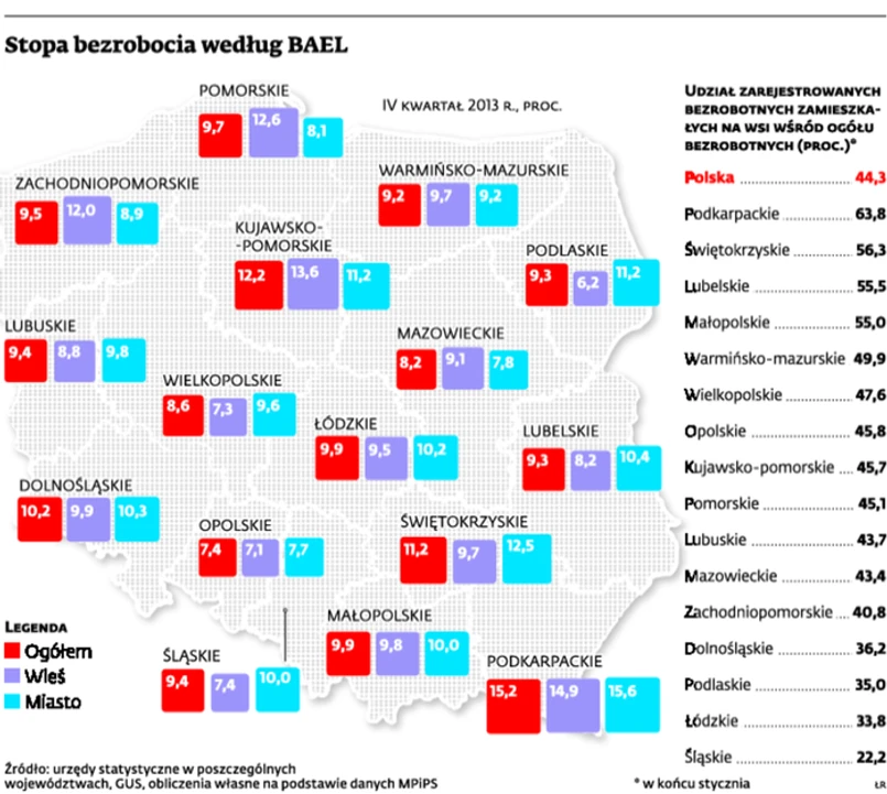 22,4 proc. – tyle wyniosła w styczniu stopa bezrobocia rejestrowanego w woj. warmińsko-mazurskim. Była to najwyższa wartość w kraju. Jeśli jednak wziąć pod uwagę nie tylko legalny rynek pracy, ale też szarą strefę, okaże się, że wskaźnik bezrobocia wynosił w tym województwie w IV kwartale ubiegłego roku zaledwie 9,2 proc. i był o 0,6 pkt proc. niższy od średniej krajowej. W rezultacie region ten jest dopiero na 13. pozycji pod względem poziomu bezrobocia liczonego na podstawie badań aktywności ekonomicznej wśród 16 województw. Faktycznie natomiast najgorsza jest sytuacja na rynku pracy w woj. podkarpackim, gdzie po uwzględnieniu szarej strefy bezrobocie wynosi aż 15,2 proc. – w tym na wsi 14,9 proc.